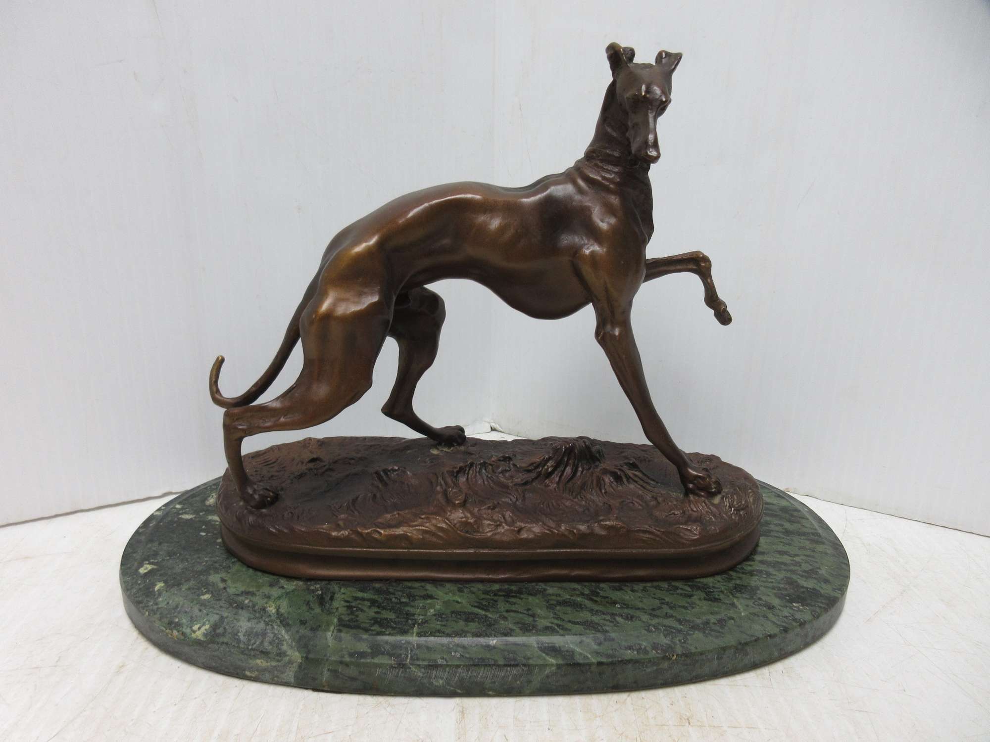 Bronze sculpture of a whippet dog.